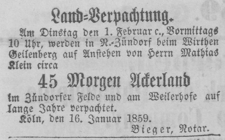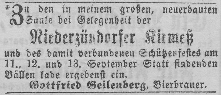 Die letzte bekannte Nennung von Gottfried Geilenberg als Brauer in Nieder-Zündorf stammt aus dem Jahr 1873. In einer Anzeige suchte er einen tüchtigen ersten Brauer.