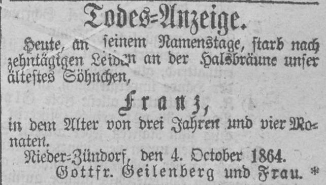 Todesanzeige des Sohnes Franz, welche im Jahr 1864, wie seine Schwester gut