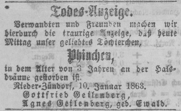 Todesanzeige der Tochter Phinchen, welche im Jahr 1863 im Alter von nur 3