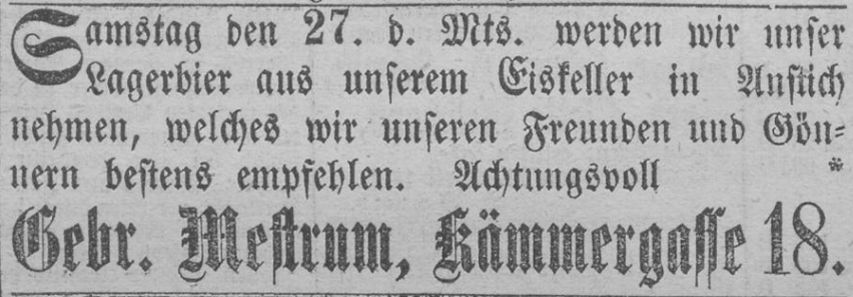 Heinrich Mestrum selbst führte von 1871 bis 1874 gemeinsam mit einem Bruder die Brauerei Gebr. Mestrum in der Kämmergasse 18. Weiter führte er, zumindest gesichert für das Jahr 1873, eine Restauration in der Waisenhausgasse 13.