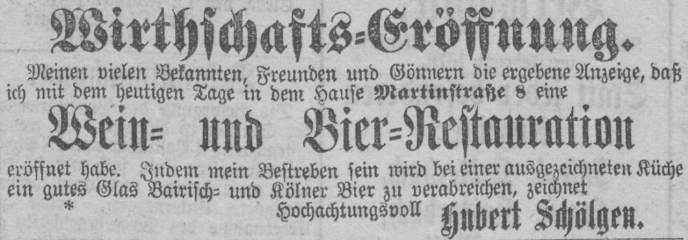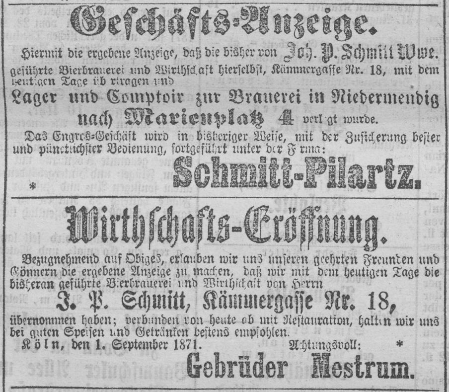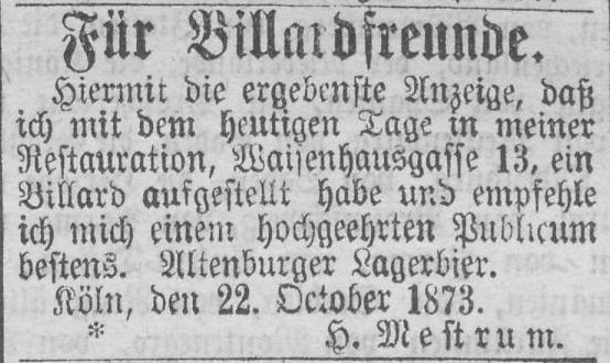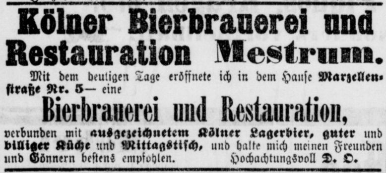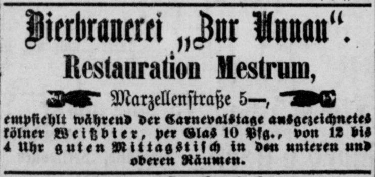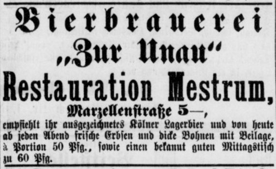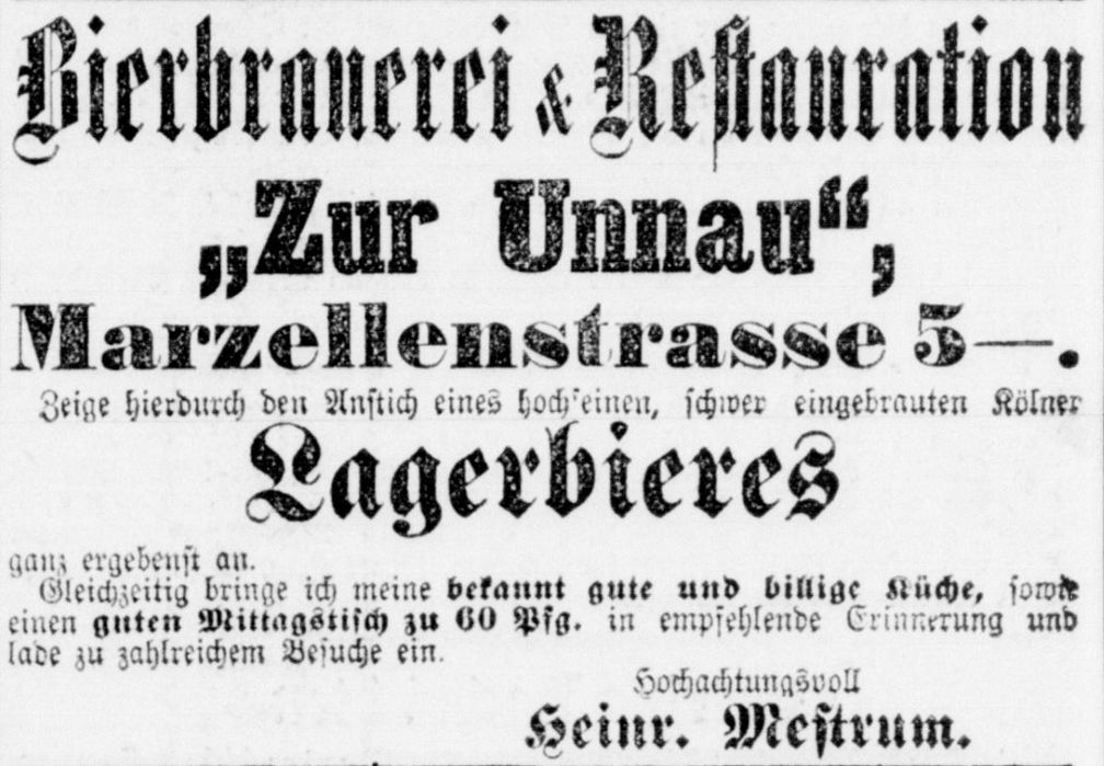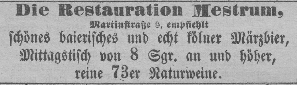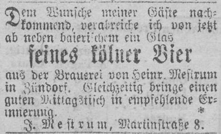 Aus dem Jahr 1875 gibt es eine Anzeige von der Restauration von J. Mestrum in der Martinstraße 8, dass in dieser ab sofort Bier „…aus der Brauerei von Heinr. Mestrum in Zündorf…“ ausgeschenkt wird.