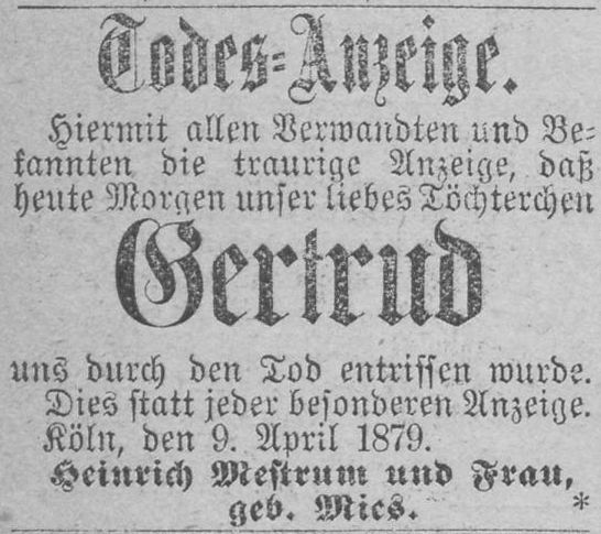 [7, 27.04.1877] „… Falliments-Anzeige. Durch Urtheil vom 18. April 1877 hat das Königliche Handelsgericht den in Nieder-Zündorf wohnenden Bierbrauer Heinrich Mestrum fallit erklärt, den Tag der Zahlungseinstellung vorläufig auf den 16. März d. J. festgesetzt … Cöln, den 19. April 1877…“.
