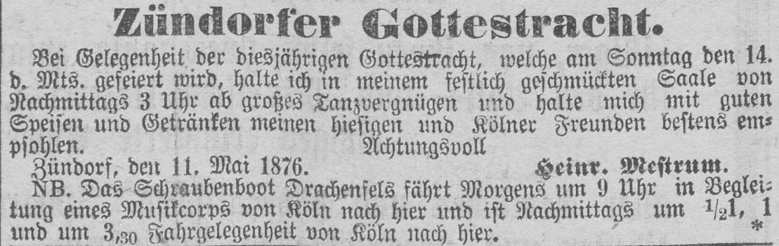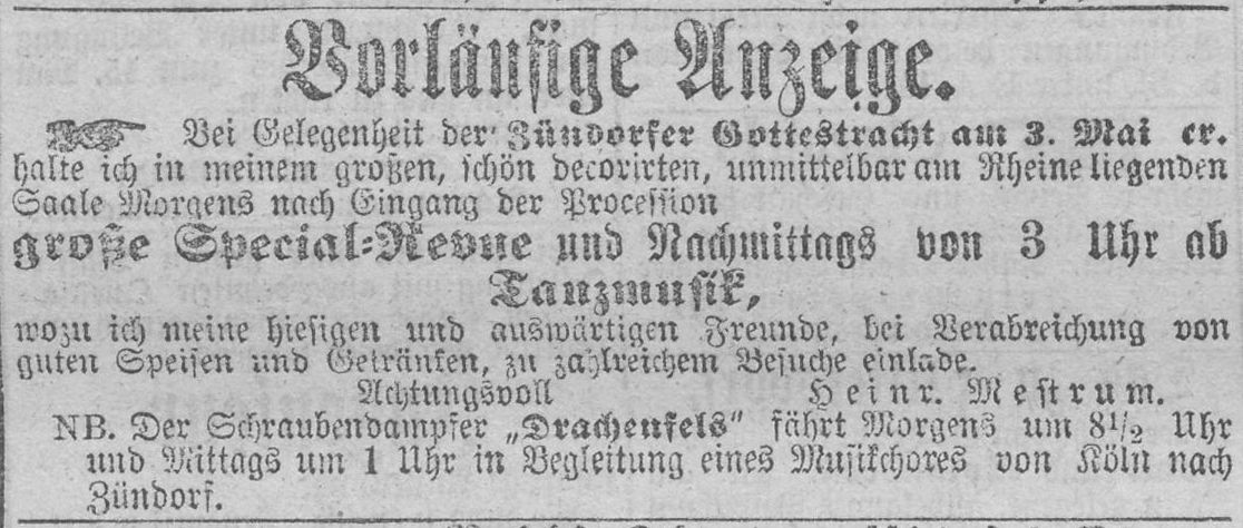 Weitere Anzeige von Heinrich Mestrum zur Zündorfer Gottestracht. Diesmal aus
