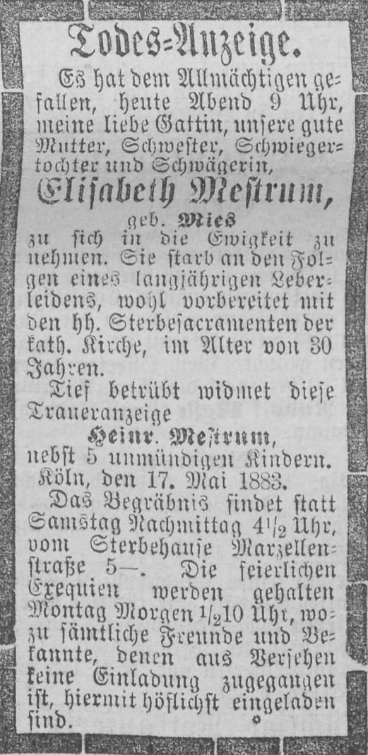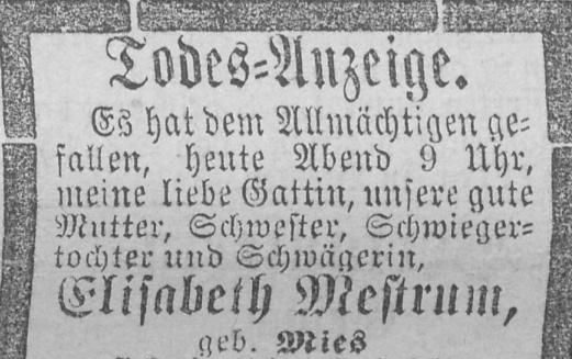Im Jahr 1883 starb Heinrich Mestrums Frau kurz nach der Geburt seines Sohnes Philipp im Alter von nur 30 Jahren. Heinrich Mestrum stand mit 5 unmündigen Kindern alleine da. So verwundert es nicht, dass er bereits 9 Monate später Elisabeth Henriette Knebel heiratete.