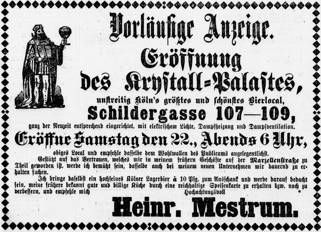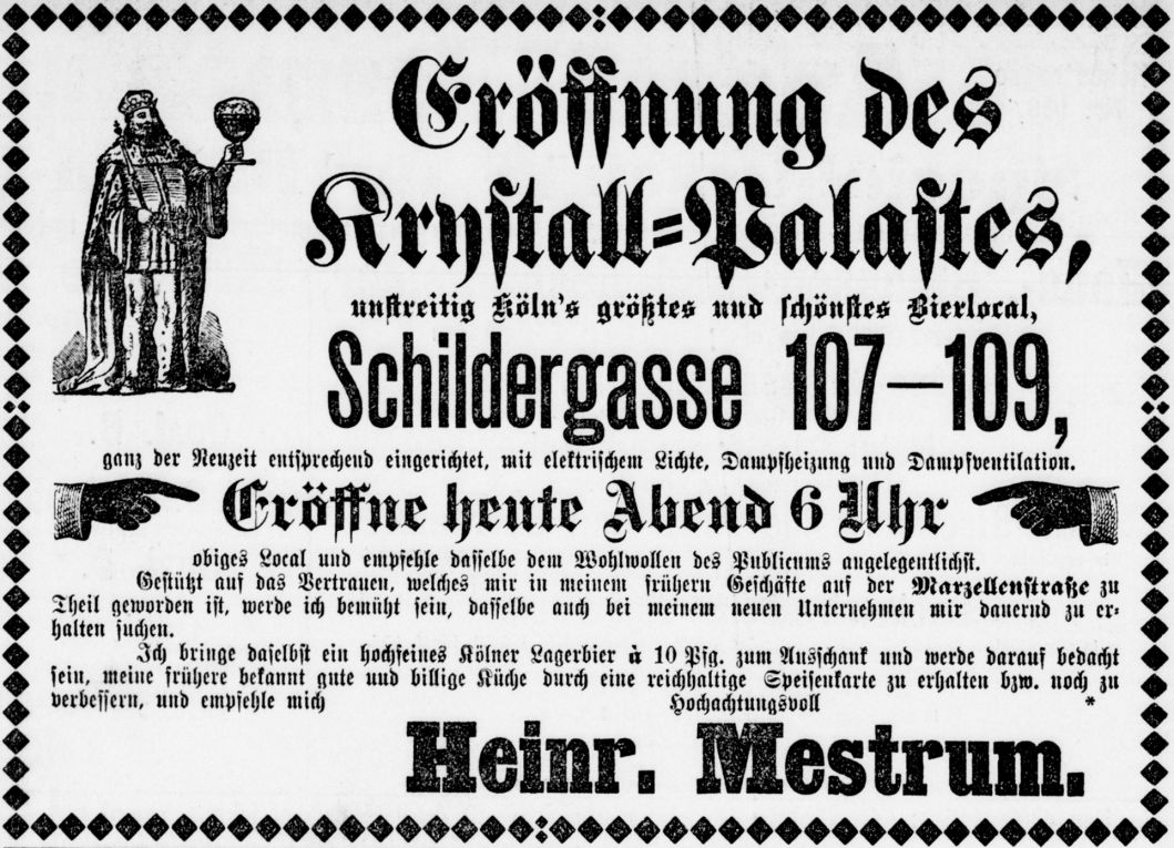 Im Jahr 1889 übernahm Heinrich Mestrum die Führung des neu erbauten Kristall-Palasts in der Schildergasse 107-109 für die mit dem Prädikat „…unstreitig Köln’s größtes und schönstes Bierlocal…“ geworben wurde. Der Kristall Palast war vom Bierbrauer Carl Schmitz aus Müngersdorf erbaut worden und war für diese Zeit modernst mit elektrischem Licht und Dampfheizung ausgestattet.
