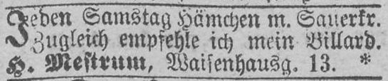 gewordene Brauerei in der Hosengasse 29 J. Mestrum, vermutlich ein Bruder von Heinrich Mestrum, führte in den 1870er Jahren eine Restauration in der Martinstraße 8.