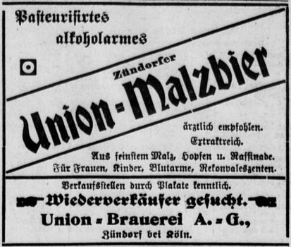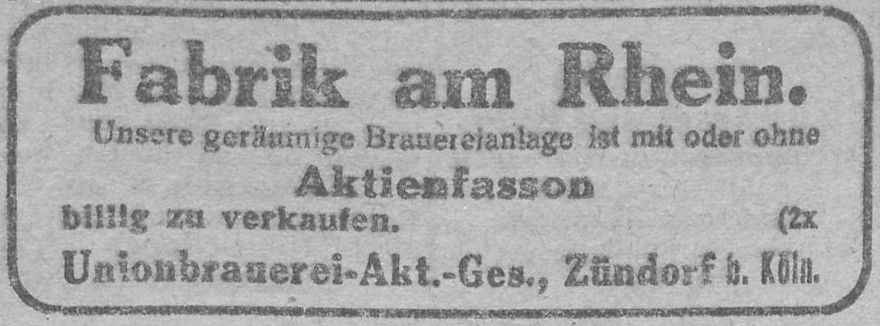 Woher das Interesse an der kleinen und eher unbedeutenden Unionbrauerei aus Zündorf kam ist unklar, vermutlich hatte die Bank schon im Jahr 1909 alle Aktien der Unionbrauerei erworben.