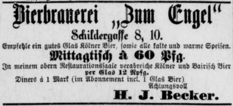 Neben der Brauerei „Zum Engel“ in der Schildergasse 8-10, welche