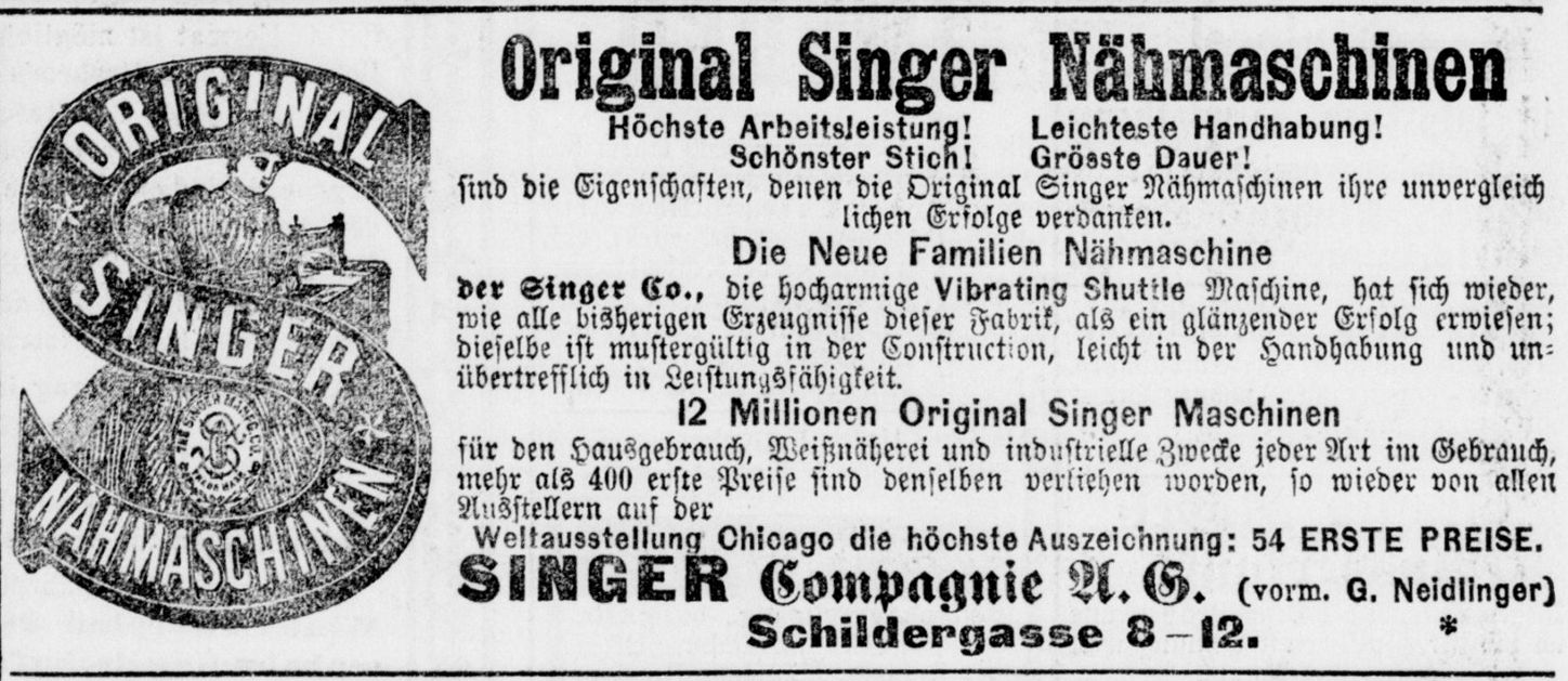 Anzeige der Singer Niederlassung in der Schildergasse 8-12 aus dem Jahr 1895