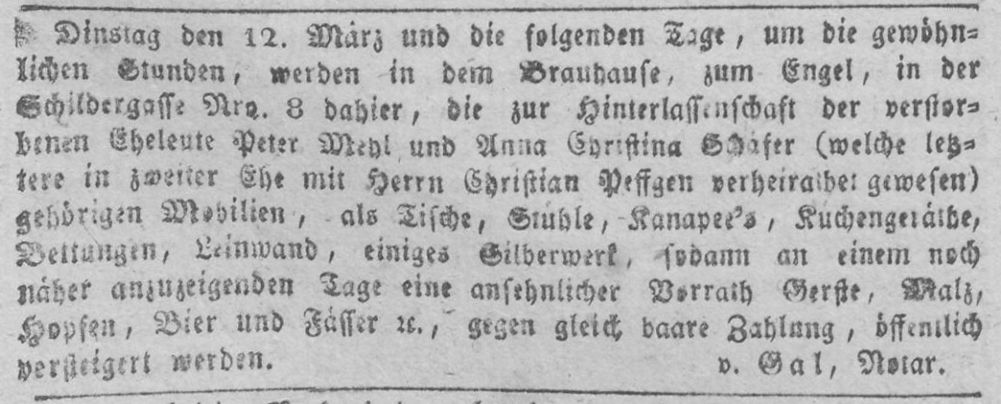 [3, 14.03.1822] „…Der Meubeln=Verkauf im Brauhause zum Engel,