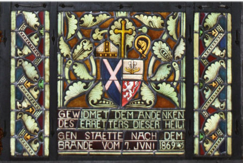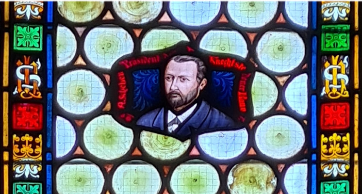 Ausschnitt aus dem rechten Ornamentfenster der Westapsis , gewidmet dem Gründer des ersten Vereins zur