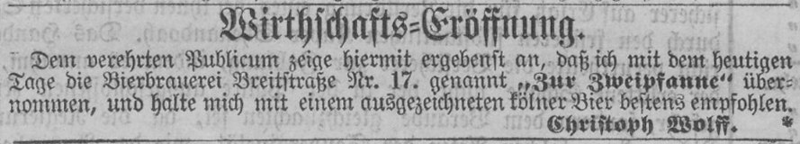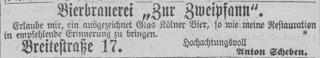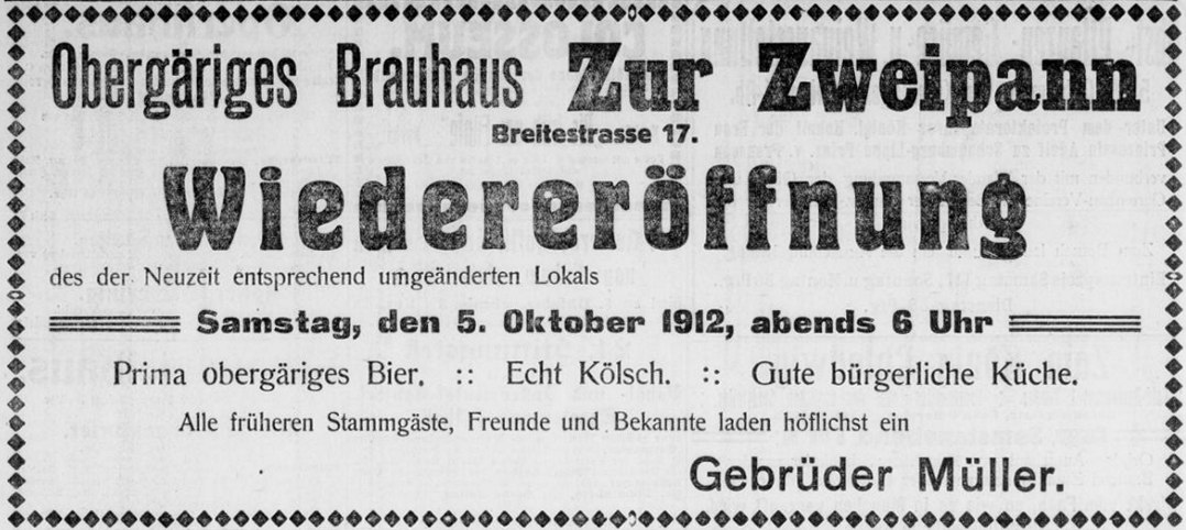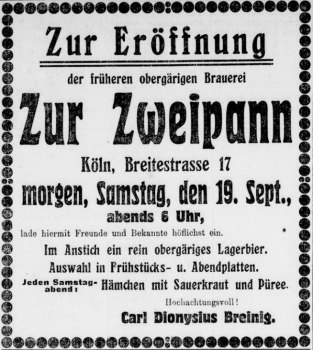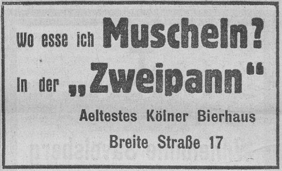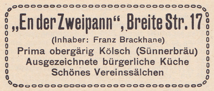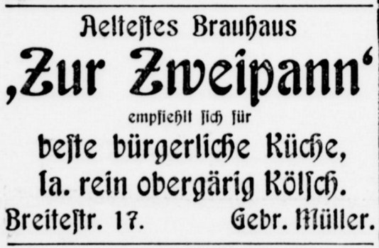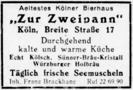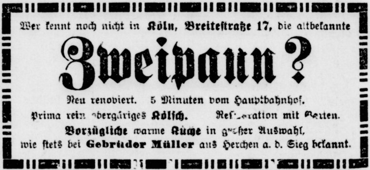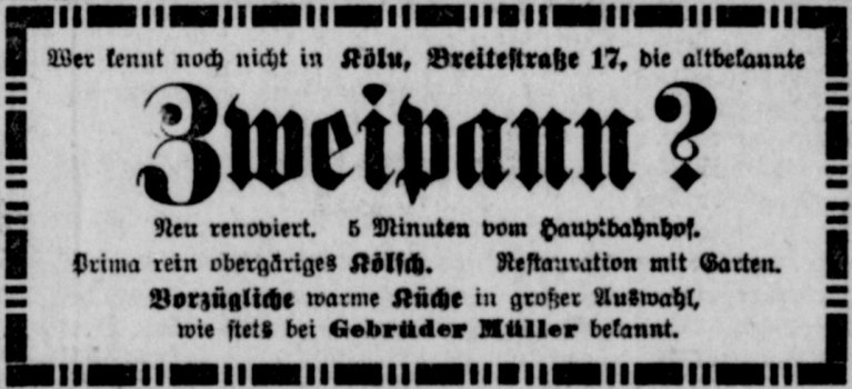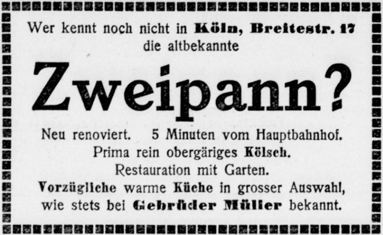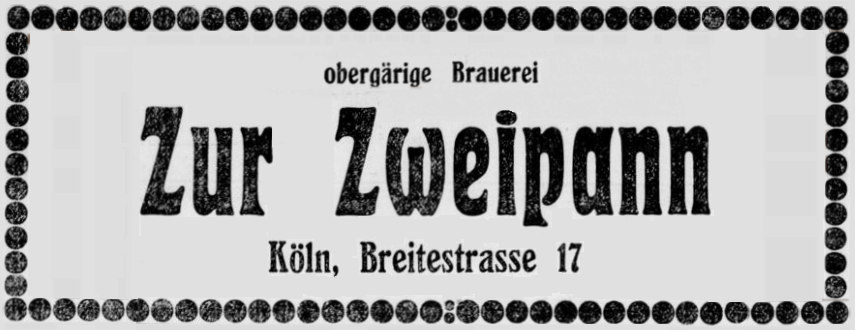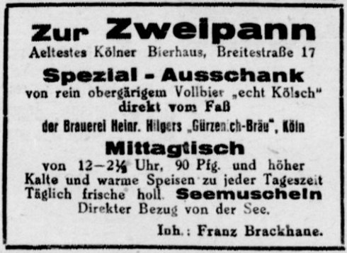 wird die Erfindung der Brauerei „Zur Zweipann“ zugeschrieben. [3, 12.12.1943] „…Altkölner Allerlei. Wo gab es den ersten „Halve