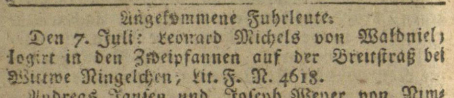 Michels von Waldniel, logirt in den Zweipfannen auf der Breitstraß bei