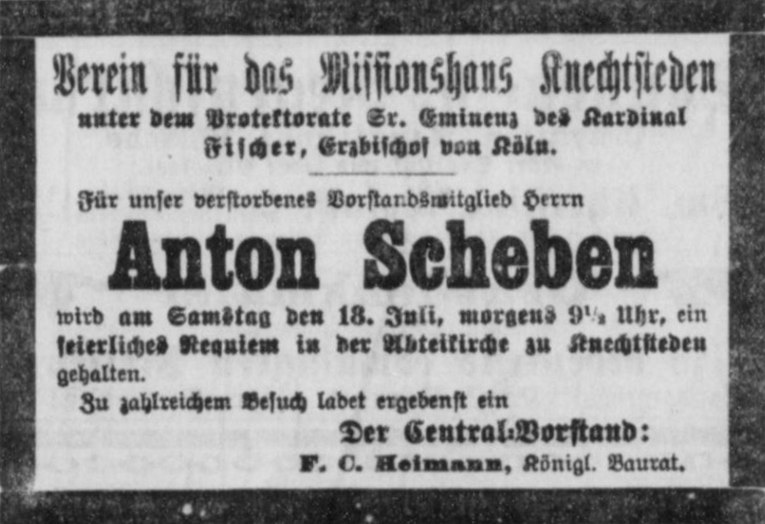 Text: "Dem hochverdienten Landrat zur Erhaltung der Abteikirche Knechtsteden