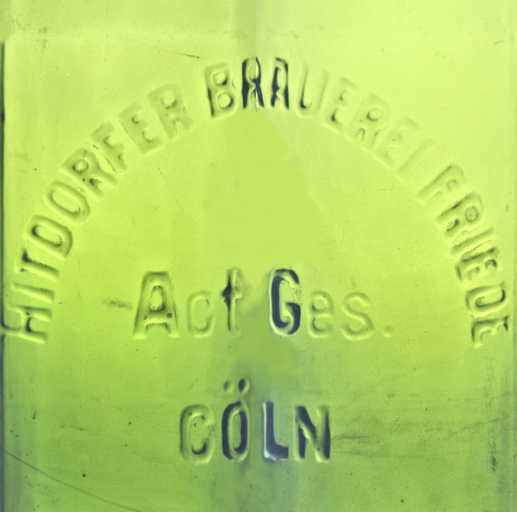 Vorderseite:  Bogen oben: "HITDORFER BRAUEREI FRIEDE", darunter gerade: "Act. Ges.", "CÖLN"